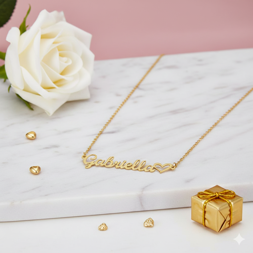Each necklace features their name (or a word that matters most) in graceful cursive script paired with a delicate heart symbol—a timeless combination of sophistication and sentiment. Choose from polished stainless steel for modern durability or luxurious 18K yellow gold finish for classic elegance.